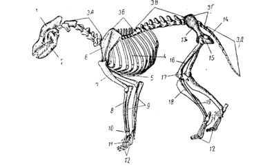 Мал.1. Скелет собаки: 1 - череп; 2 - нижня щелепа; 3 - хребетний стовп (ЗА - шийні, ЗБ - грудний, 3В - поясний, ЗГ - крестцовий, 3Д - хвостовий); 4 - ребро; 5 - грудна кістка; 6 - лопатка; 7 - плечова кістка; 8 - лучева кістка; 9 - ліктева кістка; 10 - зап’ястя; 11 - п’ясть; 12 - пальці; 13 - підвздошна кістка; 14 - сідалішна кістка; 15 - лонна кістка; 16 - стегно; 17 - колінна чашечка; 18 - велика берцова кістка; 19 - мала берцова кістка; 20, 21 - плюсна.