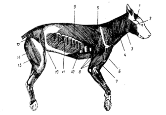 Грудна кінцівка з`єднується з хребтом ні суглобом, а міцним плечовими м`язами. Над лопаткою утворюється холка. Висота в холці вказує на висоту собаки і служить показником породи. Відхилення від стандарту вищі норм верхніх і нижніх меж є вадою. Тазова (задня) кінцівка починається з стегнової кістки, переходить в гомілку (великогомілкова і маленькогомілкова кістки), потім в передплюсну. Після цього йде плюсна, далі 4 фалангових пальці, які закінчуються кігтями. Іноді з внутрішньої сторони верхньої половини росте рудиментарний (прибулий) палець. Він не завжди з`єднаний з плюсною. В молодому віці його ампутують. Тазова кінцівка має суглобне з`єднання з тазом і фіксується м`язами тазостегнової групи. Кістки скелета з`єднані між собою за допомогою безперервних з`єднань (з утворенням зрощення - кістки черепа і таза) і переривистих з`єднань - за допомогою суглоба. Між кінцями кісток утворюється щілина - суглобна порожнина, а кінці стичних кісток покриті суглобним хрящем. Надкісниця, переходячи з однієї кістки на другу, утворює суглобну сумку, ще вона називається капсулою суглоба. Її внутрішній шар виділяє в суглобну порожнину слизисту рідину (синовію), яка служить для змащування суглобних поверхонь, що труться. Крім суглобних сумок з`єднання кісток в суглобах здійснюється за допомогою зв`язок. На передній кінцівки розрізняють слідуючи суглоби: плечовий суглоб - місце з`єднання лопатки з плечовою кісткою; ліктьовий суглоб - місце з`єднання плечової кістки з лучової та ліктевою кістками; зап`ястний суглоб - місце розташування зап`ястних кісточок; п`ястно-фаланговий суглоб; суглоби фаланг. На задній кінцівки розрізняють: тазостегновий суглоб - місце з`єднання таза з стегновою кісткою; колінний суглоб - між стегном, колінною кісткою і гомілкою; стрибальний суглоб - між гомілкою і кістками плюсни; плюсно-фаланговий суглоб; суглоби фаланг.