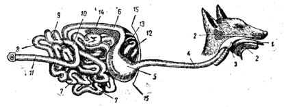 1 - ротова порожнина; 2 - слинні залози; 3 - глотка; 4 - стравохід; 5 - шлунок; 6 - дванадцятипала кишка; 7 - тонка кишка; 8 - подвздошна кишка; 9 - сліпа кишка; 10 - ободочна кишка; 11 - пряма кишка; 12 - печінка; 13 - жовчний міхур; 14 - підшлункова залоза; 15 - діафрагма.