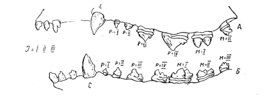 Р-І, II, Ш, IV - премоляри; М-I, II, III - моляри; Р-IV - сікущі зуби.