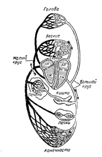 Розрізняють два кола кровообігу - великий і малий. Велике коло кровообігу починається в лівому шлуночку серця. Від лівого шлуночка відходить аорта, яка розгалужується на дві артерії. Одна з них прямує в сторону тулуба і задніх кінцівок, а друга - в сторону голови і передніх кінцівок. Артеріями кров розноситься по всьому організму. Проходячи через капіляри, кров віддає клітинам поживні речовини і кисень і отримує із тканин продукти обміну речовин і вуглекислоту. Після цього кров поступає в вени і повертається до серця, в його праве передсердя. Із правого передсердя кров поступає в правий шлунок, де і закінчується велике коло кровообігу.