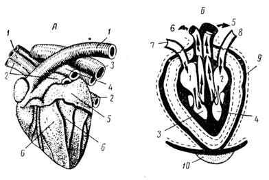 Мал.5. Серце: А - загальний вигляд: 1 - артерії; 2 - вени; 3 - стравохід; 4 - бронхи; 5 - передсердя; 6 - шлуночки; Б-повздовжній розріз: 1 - праве передсердя; 2 - ліве передсердя; 3 - правий шлуночок; 4 - лівий шлуночок; 5 - артерія (аорта); 6 - легенева артерія; 7-пола вена; 8 - легенева вена; 9 - серцева сумка; 10 - грудна кістка.
