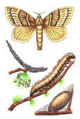 Среди указанных вредителей наиболее опасным является сибирский шелкопряд (сибирский коконопряд) – бабочка семейства коконопрядов. Это крупная бабочка (у самок крылья в размахе 60-80 мм, у самцов – 40-60 мм), окраска которой варьирует от светло-коричневого до черного цвета. Встречается от Урала до Приморья. Яйца (200-800 в кладке) самка откладывает на хвою, ветви и стволы деревьев. Через 2-3 недели появляются гусеницы до 7 см длиной, питающиеся хвоей и зимующие под лесной подстилкой. Весной они поднимаются в крону и объедают старую хвою, а осенью вновь уходят на зимовку. Весной третьего года гусеницы питаются Сибирский коконопряд наиболее интенсивно и в июне окукливаются в коконе. Через месяц из куколки выходят бабочки. Вспышки массового размножения возникают после 2-3 засушливых лет и длятся 7-10 лет. Очаги возникают в изреженных рубками и пожарами лесах.