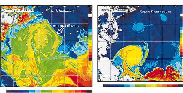 В Тихоокеанском океанологическом институте РАН уже около 20 лет ведутся наблюдения за большими антициклоническими вихрями, формирующимися на западе Тихого океана, в зоне слияния двух главных течений этого региона: Ойясио и Куросио [2-4]. Растянутые вдоль всей длины Курило-Камчатского желоба, эти вихри медленно движутся на северо-восток, против основного потока Ойясио, в субарктические воды. Свойства вихрей (их размеры, температура и соленость в ядре) не постоянны. Изменчивость такого масштаба оказалась самой большой из наблюдавшейся где-либо еще в океане. Кроме того, вихри стали новым индикатором вариаций климата океана.