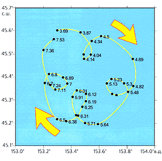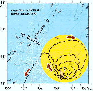 Динамическая топография (возвышения поверхности океана из-за разного распределения плотности) вихрей у пролива Буссоль в разные годы. Серым цветом показаны вихри Ойясио, красными стрелками - положение струй Ойясио. Хорошо заметно изменение размеров вихрей и смена главных струй течения: с морской (02 – 1990 г.) на прибрежную (01 – 1996 г.) и снова на морскую (в 2000 г.). Рисунок из работы [4].