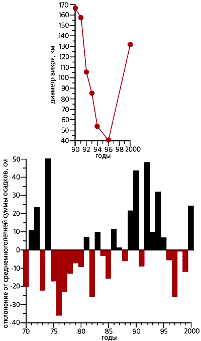 | Изменение диаметра вихрей Ойясио (вверху) и аномалии осадков (отклонение от среднемноголетней суммы) во Владивостоке. Цветом показаны отрицательные аномалии, соответствующие засухе, особенно сильной в 1976 и 1997 гг.; черным - отмечены годы с положительной аномалией, во время которых случались наводнения. |
