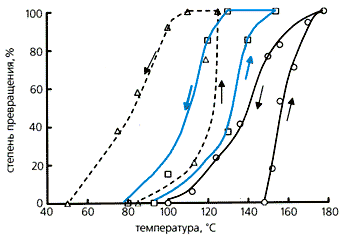 Если реакция эндотермическая, т.е. идет с поглощением тепла, или ее тепловой эффект близок к нулю, ожидать проявления в ней температурного гистерезиса, видимо, не следует. Мы проверили и это, выбрав в качестве эндотермической реакции дегидрирование изобутана, а реакции, идущей практически без теплового эффекта, - изомеризацию бутена-2 в бутен-1. Как и ожидалось, в обоих случаях гистерезис на кривых зависимости степени превращения исходных соединений от температуры не был обнаружен.