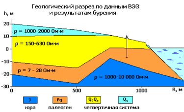 На основании полученных данных следует вывод о перераспределении золота, за счет частичного перемыва нижнечетвертичной толщи, и концентрировании его в верхах палеогена. Необходимо было уточнить разрез по мощности и простиранию, а также решить вопрос о глубине залегания коренных пород. Для выполнения этой задачи было решено привлечь геофизические методы исследований, в частности - вертикальные электрические зондирования (ВЭЗ). Из-за хорошей дифференциации толщ по сопротивлению, они были очень уверенно выделены и идентифицированы при интерпретации. Полученный разрез по данным ВЭЗ представлен ниже.