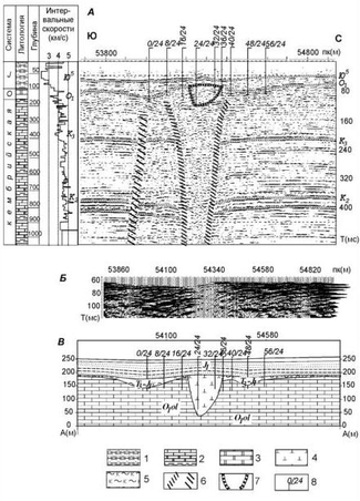 Рис.1. Временной МОГТ (А), динамический МПВ (Б) и геологический (В) разрезы по профилю 44.9 через трубку Нюрбинскую: 1 - песчано-глинистые юрские отложения, 2- терригенно-карбонатные породы, 3 -доломиты, 4 - кимберлиты, 5 - отложения дяхтарской толщи, 6 - тектонические нарушения, 7 - контур кимберлито-вой трубки, 8 - разведочные скважины.