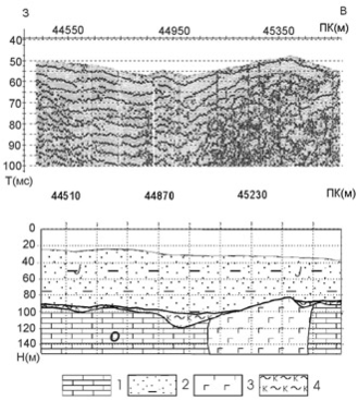Рис.2. Интрузия основного состава в высокочастотном волновом поле: А - разрез мгновенной частоты, Б -геологический разрез, 1 - карбонатные породы, 2 - песчано-глинистые юрские отложения, 3 - габбро-долериты, 4 -дяхтарская толща.