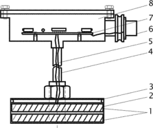 Катушки индуктивности 1 (рис. 1) помещены в корпус из нержавеющий стали 2. Для повышения влагостойкости, а так же вибро- и ударопрочности корпус с ферритовыми кольцами заливается герметиком. Сформировать жидкостной виток электрической связи из исследуемой жидкости позволяет фторопластовая крышка 3, герметично закрывающая корпус с катушками. Датчик легко разбирается, следовательно, ремонтопригоден. Корпусы датчика и блока электроники соединены между собой металлической трубкой 4. В полость трубки помещены соединительные провода 5, защищенные экраном.