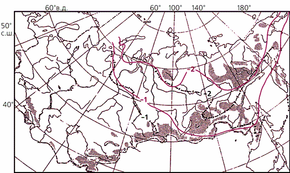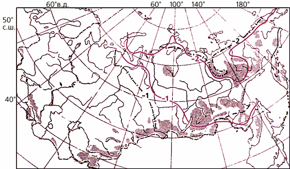 При восстановлении динамики ее различных подзон в течение интересующих нас двух теплых эпох был применен индекс относительной суровости I, представляющий собой отношение минимальной (как правило, января) и максимальной (как правило, июля) среднемесячной температуры воздуха (в °С). Этот показатель, разработанный на основе эмпирических данных одним из авторов статьи, В.П.Нечаевым, характеризует локальные климатические условия, благоприятные для образования мерзлых грунтов [6]. С его помощью можно воспроизвести современное положение границы вечной мерзлоты: для сплошной многолетней значение индекса оказалось меньше –2, а для распространения мерзлоты вообще – меньше –1.