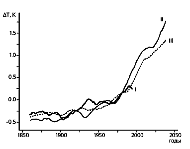 | Изменения средней глобальной температуры по данным наблюдений (I) и по модели общей циркуляции атмосферы и океана Института метеорологии Макса Планка: при росте концентрации парниковых газов по сценарию business as usual без учета эмиссии сульфатных аэрозолей (II) и с учетом этой эмиссии (III). |