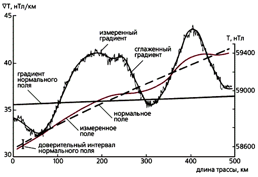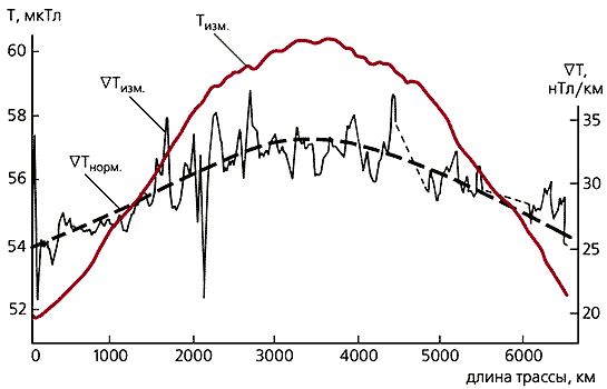 Профили полного магнитного поля (Т) и его вертикального градиента (СТ) на высоте 30 км над Витимским нагорьем. Относительно главного магнитного поля аномалии разделяются на положительные и отрицательные.