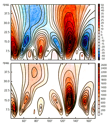 Новое весьма неожиданное решение получило представление аномального поля в частотной области с помощью вейвлет-анализа (Иванов В.В., Ротанова Н.М. // Геомагнетизм и аэрономия. 2000. Т.40. №2. С.78-83). На сегодняшний день этот “математический микроскоп” способен дать не только общую структуру рассматриваемого сигнала, но и изучить его локальные особенности. Вейвлетное преобразование приведенного ранее спутникового профиля показано на рисунке. В структуре коэффициентов выделяются различные неоднородности: мелкомасштабные (4-5°); долготные (10-12°) и, наконец, крупномасштабные (20-30°).