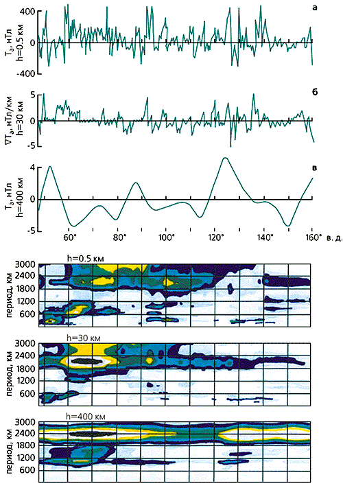 Мы подошли теперь к наиболее сложной проблеме в исследовании аномальных магнитных полей - природе магнитных аномалий. К сожалению, на сегодняшний день нет математических подходов, при помощи которых по данным об аномальном поле можно судить о пространственном распределении его источников. Практически все методы, применяемые для идентификации источников магнитных аномалий, основываются на результатах их пространственного спектрального анализа. Для его проведения использовались профили аномального магнитного поля, полученные на приземных, стратосферных и спутниковых высотах. Динамические характеристики спектров определены методом узкополосной фильтрации, в основу которого положено выделение гармонических составляющих с помощью адаптивных фильтров. Методика спектрального анализа, основанная на адаптивной фильтрации, позволяет получить не только одномерное, но двумерное и даже трехмерное представление рассматриваемого ряда в спектральной области. Видны не только характерные периоды в спектрах, но и их изменения по всей длине профиля. Длиннопериодные изменения L = 500-3000 км выделяются на всех высотах. Кроме того, магнитные аномалии с такими периодами имеют максимальную интенсивность не по всей длине профиля. Выделяются три области: 60-70°, 120-140°, 150-160° в.д., относящиеся соответственно к районам Урала, Алданского щита и Охотоморской плиты. Структура аномального магнитного поля даже на спутниковых высотах очень сложна.