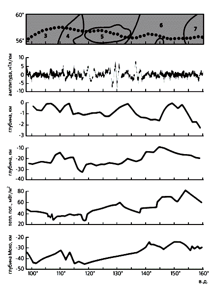 Результаты определения границ магнитоактивного поля над территорией Восточной Сибири, по данным спектрального анализа. Вверху - трасса полета аэростата и тектоническая зональность региона (расшифровка цифровых обозначений такая же, как на предыдущем рисунке); далее, сверху вниз, профили: аномальных магнитных градиентов; верхних кромок магнитоактивного слоя земной коры; нижних кромок магнитоактивного слоя земной коры; теплового потока; границы Мохоровичича.