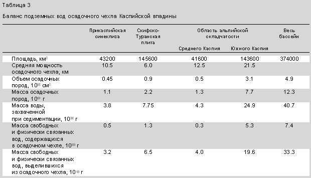 Это районирование и легло в основу приближенной оценки масс подземных вод в осадочном чехле Каспийского бассейна. Мощность пород в нем колеблется от 5-6 км в зоне Скифско-Туранской плиты до 30 км в Южной мегавпадине. За нижнюю границу осадочных отложений приняты разновозрастные породы консолидированного фундамента.