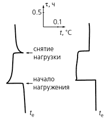 Рис. 2. Временной ход температуры мерзлого грунта при его нагружении и разгрузке. Слева - кривая для супеси пылеватой при начальной температуре te = –0.5°C, справа - для глины при te = –0.75°C. В обоих случаях внешняя нагрузка равна 3 МПа.