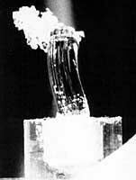 Что же может происходить с мерзлой породой, если в ней содержится незамерзшая вода? На рис. 1 приведена фотография ледяного тела - сплошного монокристалла, растущего на поверхности керамического тонкопористого фильтра. Фильтр помещен в стеклянную, заполненную водой U-образную трубку и виден на рисунке, как облачко, под основанием ледяного столбика. (Облачко наверху столбика - снежный комок, использованный как затравка на начальной стадии роста льда.) Верхняя часть фильтра вместе со льдом находятся при отрицательной температуре, а нижняя, соприкасающаяся с водой в трубке, - при положительной.