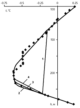 Посмотрим внимательно на рис. 3, где ромбиками показаны фактические данные измерения температуры мерзлых пород в специально оборудованной термометрической скважине на севере Тюменской области. Эксперимент готовился очень тщательно, что обеспечило точность измерения в 0.01°С, так что сомнения в достоверности данных отпадают. Слой мерзлого грунта, залегающий в интервале глубин h = 140-240 м, перекрывается талым водонасыщенным прослоем толщиной около 50 м. Выше, до самой поверхности массива, лежит еще один слой мерзлой породы, который не показан на рисунке. Нижний слой мерзлоты образовался во время прошлых похолоданий климата, а последующие потепления вызвали оттаивание только верхней части массива. Грунт, оставшийся при этом в мерзлом состоянии, называется реликтовым.