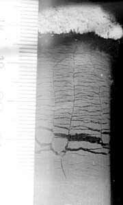 Картина слоистости - текстура мерзлого грунта - оказывается связанной со свойствами грунта и условиями его промерзания. Например, при некоторых условиях для грунта данного типа толщина ледяных линз может превысить высоту начальной талой колонки. Вообще же по текстуре мерзлого грунта можно в принципе восстановить температурные условия его промерзания. Подобную слоистость мы видим и в природных толщах мерзлой породы. Она прослеживается до весьма значительных глубин - 100-150 м. Максимальная же толщина ледяных линз наблюдается в верхних 10-40 м. Ниже их толщина монотонно снижается, а расстояние между линзами увеличивается. Довольно часто в верхних слоях мерзлого грунта обнаруживаются слои льда толщиной от единиц до нескольких десятков метров.