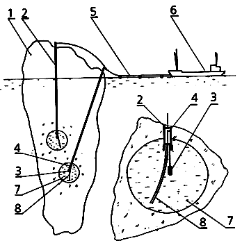 Рис. 10. Схема добычи пресной воды из ледяных массивов. 1 - айсберг, 2 - ствол скважины, 3 - нагреватель, 4 - насос, 5 - шланг, 6 - танкер, 7 - проплавленная полость, 8 - патрубок.