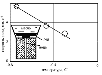 Другой пример взят из лабораторной практики. На рис. 7 показано изменение скорости роста льда в зависимости от температуры охлаждения. Были проведены два похожих опыта, но непонятным образом в одном случае скорость возрастала с понижением температуры, а в другом - падала. Объяснить это удается, только с помощью точных уравнений. Оказывается, при одних и тех же внешних условиях возможно существование двух устойчивых режимов роста, отличающихся протяженностью корневой системы и по-разному реагирующих на изменение температуры.