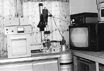 Капелька концентрирует внутри себя большую часть примесей и потому остается незамерзшей в ледяном теле. При наложении на лед градиентного поля температуры все микроскопические образования начинают медленно перемещаться в более теплую сторону льда. В этих условиях с течением времени происходит его самоочистка. Например, так происходит опреснение морского льда, который в момент формирования содержит многочисленные капельки рассола. Для оценки возраста самого льда важно знать закономерности перемещения включений. В лабораториях создаются специальные криоскопические установки (рис. 8), где наблюдаемые в микроскоп процессы выводятся на экран телевизора или компьютера, а запоминающие устройства позволяют воспроизвести все детали явлений.