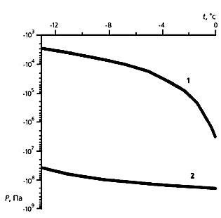 Рис. 9. Растягивающее напряжение внутри жидкого включения во льду при разных температурах. Вследствие текучести льда напряжения в капле снижаются по абсолютной величине более чем на три порядка (кривая 1) по сравнению со значениями, отвечающими его недеформируемой идеализации (кривая 2). Благодаря этому движущаяся во льду капля не содержит пузырьков пара.
