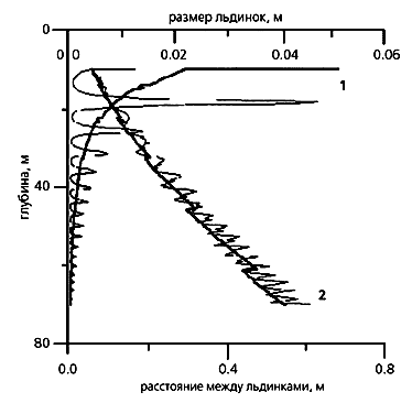 Рис. 6. Нарушение плавного изменения параметров криотекстуры при колебаниях уровня водоема, с которым грунт имеет гидравлическую связь. Толстые линии соответствуют постоянному уровню воды, тонкие - колебаниям уровня с амплитудой 10 м. 1 - кривая распределения по глубине толщины льдинок, 2 - расстояний между ними.