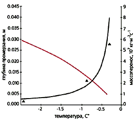 Два графика на рис. 9 показывают, что вследствие текучести льда напряжения в капле снижаются по абсолютной величине более чем на три порядка от значений, отвечающих его недеформируемой идеализации. Правильно построенная теория позволяет решить целый ряд других важных вопросов. Например, из теории движения капель следует, что их скорость не должна зависеть от начального радиуса - это действительно наблюдается в опыте. Другой вывод теории, который не подвергался экспериментальной проверке, состоит в том, что аналогичные жидкие включения перемещаются и в мерзлом грунте, причем со скоростью в несколько раз выше, чем во льду. Причина - существенно меньшие затраты в этом случае на фазовый переход, так как часть жидкости замещается минеральными частицами. Получает объяснение и еще один загадочный факт - блуждание больших скоплений рассола, так называемых криопэгов, внутри мерзлой толщи. (Вспомним, что скорость перемещения включений не зависит от их радиуса.) Это явление отмечено в Якутии и на западном побережье Ямала. Вероятнее всего, блуждание криопэгов обязано естественным температурным градиентам, которые всегда присутствуют в природной среде.