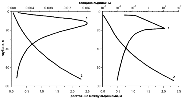Рис. 5. Расчетные зависимости параметров слоистой криогенной текстуры от глубины при коэффициенте гидропроводности 10–11 (слева) и 10–10 м3·с·кг–1. Кривые (1) показывают немонотонное изменение толщины ледяных линз; при повышенной водопроницаемости грунта (справа) расчет предсказывает образование массивного ледяного тела в верхней части пласта. Кривые (2) отвечают монотонному увеличению с глубиной расстояний между льдинками.