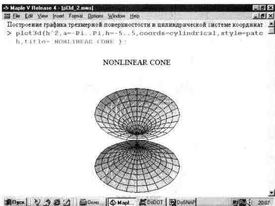 Как отмечалось, вид графика трехмерной поверхности существенно зависит от выбора координатной системы. Рис. 13.16 показывает пример построения нелинейного конуса в цилиндрической системе координат. Для задания такой системы координат используется параметр coords=cylindrical.