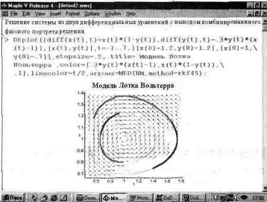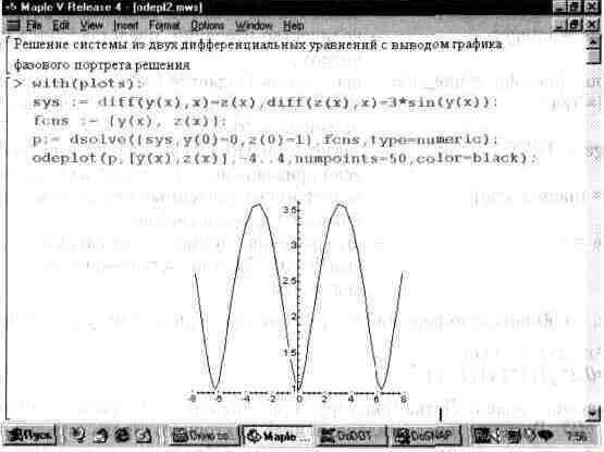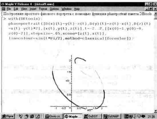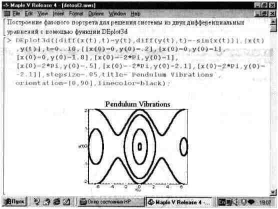 Обычное решение, как правило, более наглядно, чем фазовый портрет решения. Однако для специалистов (например, в теории колебаний) фазовый портрет порою дает больше информации, чем обычное решение. Он более трудоемок при построениях, поэтому возможность Maple V быстро строить фазовые портреты трудно переоценить.