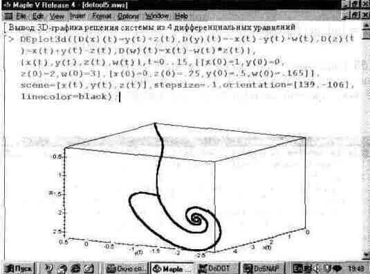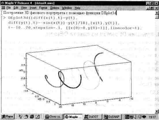 Рис. 13.53. Пример решения системы из двух дифференциальных уравнении с построением трехмерного фазового портрета.