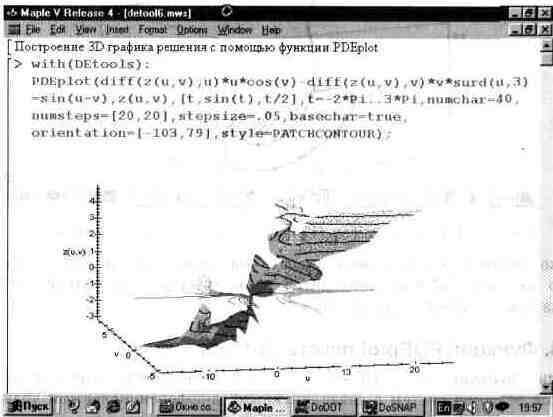 Рис. 13.55 показывает применение функции PDEplot. Этот пример, взятый из справочной системы Maple V R4, показывает, насколько необычным может быть решение даже простой системы дифференциальных уравнений в частных производных.