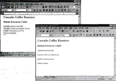 Рис. 6.3 иллюстрирует, с какой легкостью можно переместить материал из Word в Редактор Frontpage. Девушка из отдела кадров "Cascade Coffee Roasters" по привычке начала набирать текст для домашней страницы RoasterNet в Word, но администратор сервера компании строго указал ей, что следует использовать Frontpage. И пусть написано-то было всего несколько строк, но зачем же делать лишнюю работу, надо просто перенести текст из Word в Редактор Frontpage.