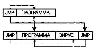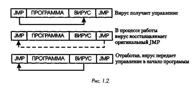 чив работу, вирус восстанавливает оригинальный JMP и передает уп-