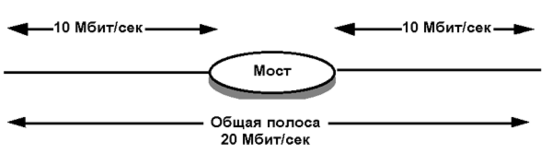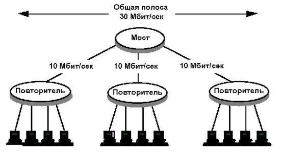Другим важным отличием мостов от повторителей является то, что сегменты, подключенные к повторителю образуют одну разделяемую среду, а сегменты, подключенные к каждому порту моста образуют свою среду с полосой 10 Mbps. При использовании моста пользователи одного сегмента разделяют полосу, а пользователи разных сегментов используют независимые Среды. Следовательно, мост обеспечивает преимущества как с точки зрения расширения сети, так и обеспечения большей полосы для каждого пользователя.