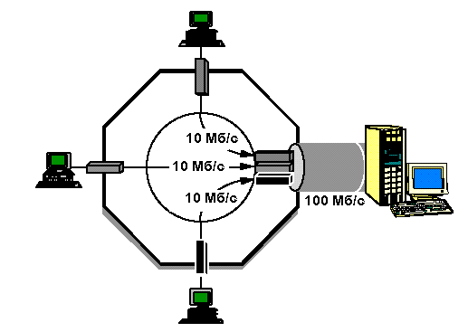 Поддержка различных скоростей полезна также для объединения групповых коммутаторов Ethernet с использованием концентраторов 100 Mbps Fast Ethernet (100Base-T) в качестве локальных магистралей (local backbone). В показанной на рисунке 9 конфигурации коммутаторы, поддерживающие скорости 10 Mbps и 100 Mbps подключены к концентратору 100 Mbps. Локальный трафик остается в пределах рабочей группы, а остальной трафик передается в сеть через концентратор 100 Mbps Ethernet.