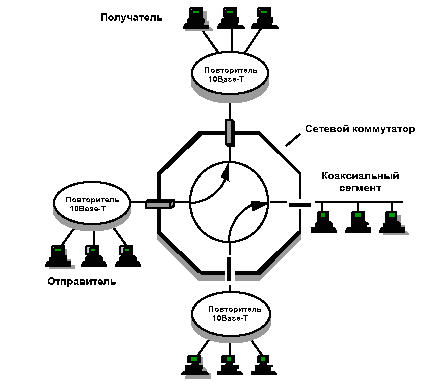 На уровне рабочей группы каждый узел разделяет полосу 10 Mbps с другими узлами в том же сегменте. Пакет, адресованный за пределы данной группы, будет передан магистральным коммутатором как показано на рисунке 10. Магистральный коммутатор обеспечивает одновременную передачу пакетов со скоростью среды между любыми парами своих портов. Подобно коммутаторам для рабочих групп, магистральные коммутаторы могут поддерживать различную скорость для своих портов. Магистральные коммутаторы могут работать с сегментами 10Base-T и сегментами на основе коаксиального кабеля. В большинстве случаев использование магистральных коммутаторов обеспечивает более простой и эффективный способ повышения производительности сети по сравнению с маршрутизаторами и мостами.