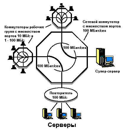 Основным недостатком при работе с магистральными коммутаторами является то, что на уровне рабочих групп пользователи работают с разделяемой средой, если они подключены к сегментам, организованным на основе повторителей или коаксиального кабеля. Более того, время отклика на уровне рабочей группы может быть достаточно большим. В отличие от узлов, подключенных к портам коммутатора, для узлов, находящихся в сегментах 10Base-T или сегментах на основе коаксиального кабеля полоса 10 Mbps не гарантируется и они зачастую вынуждены ждать, пока другие узлы не закончат передачу своих пакетов. На уровне рабочей группы по прежнему сохраняются коллизии, а фрагменты пакетов с ошибками будут пересылаться во все сети, подключенные к магистрали. Перечисленных недостатков можно избежать, если на уровне рабочих групп использовать коммутаторы взамен хабов 10Base-T. В большинстве ресурсоемких приложений коммутатор 100 Mbps может выполнять роль скоростной магистрали для коммутаторов рабочих групп с портами 10 и 100 Mbps, концентраторами 100 Mbps и серверами, в которых установлены адаптеры Ethernet 100 Mbps.