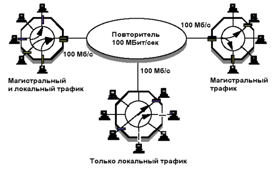 Для подключения к повторителю 10 или 100 Mbps коммутатор должен иметь порт, способный работать с большим числом адресов Ethernet.