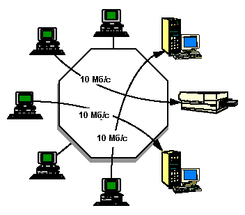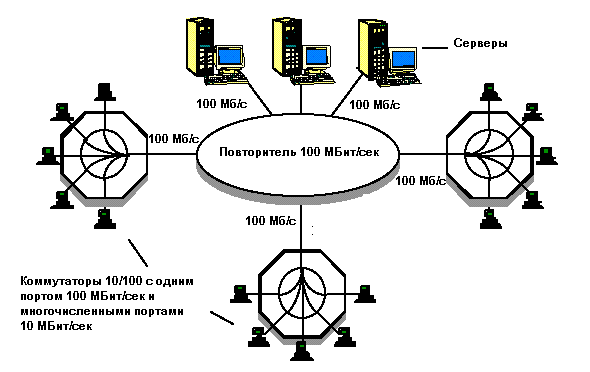 В нашем примере рабочие станции имеют выделенную полосу 10 Mbps для доступа к серверам через коммутатор рабочей группы и концентратор 100 Mbps Ethernet. Концентратор 100Base-T и корпоративные серверы обычно располагаются в одном помещении, а коммутаторы рабочих групп устанавливаются вблизи этих групп и соединяются с хабом стандартными кабелями.