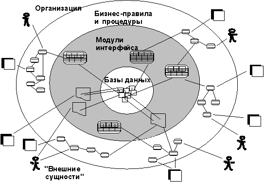 Любая ИС (рисунок 3.1) представляет собой набор модулей, исполняемых процессорами и взаимодействующих с базами данных. Базы данных и процессоры могут располагаться централизованно или быть распределенными. События в системе могут инициироваться внешними сущностями, такими как клиенты у банкоматов или временные события (конец месяца или квартала). Все транзакции осуществляются через объекты или модули интерфейса , которые взаимодействуют с одной или более базами данных.