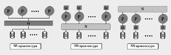 Рис.3. Три классические архитектуры: SE-архитектура с разделяемой памятью и дисками, SD-архитектура с разделяемыми дисками, SN-архитектура без совместного использования ресурсов. В SE-системах все процессоры P с помощью общей шины подключаются к разделяемой памяти M и дискам D. Процессоры передают друг другу данные через общую память. В SD-системах каждый процессор имеет свою собственную память, однако диски по-прежнему разделяются всеми процессорами. Для связи процессоров друг с другом используется высокоскоростная соединительная сеть N. В SN-системах каждый процессор имеет собственную память и собственный диск. Обмен данными между процессорами, как и в предыдущем случае, происходит через высокоскоростную соединительную сеть.