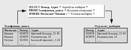 Рис.1. Пример запроса на языке SQL, выбирающего из отношения Телефонная_книга номера телефонов и адреса всех абонентов с фамилией Иванов.