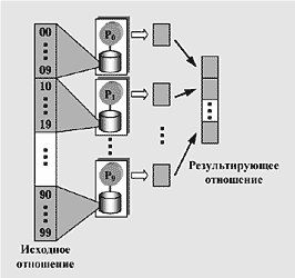 Рис.2. Параллельное выполнение запроса. Исходное отношение разбивается на фрагменты по первым двум цифрам телефонного номера. Каждый фрагмент имеет свои собственные диск для хранения и процессор для обработки. Результирующее отношение объединяет данные, поставляемые отдельными узлами системы.