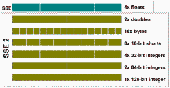 SSE2 же оперирует с теми же самыми регистрами и обратно совместим с SSE процессора Pentium III. А столь впечатляющее расширение набора команд вызвано тем, что теперь операции со 128-битными регистрами могут выполняться не только как с четверками вещественных чисел двойной точности, но и как с парами вещественных чисел двойной точности, с шестнадцатью однобайтовыми целыми, с восемью короткими двухбайтовыми целыми, с четырьмя четырехбайтовыми целыми, с двумя восьмибайтовыми целыми или с 16 байтовыми целыми. То есть, теперь SSE2 представляя собой симбиоз MMX и SSE и позволяет работать с любыми типами данных, влезающими в 128-битные регистры.